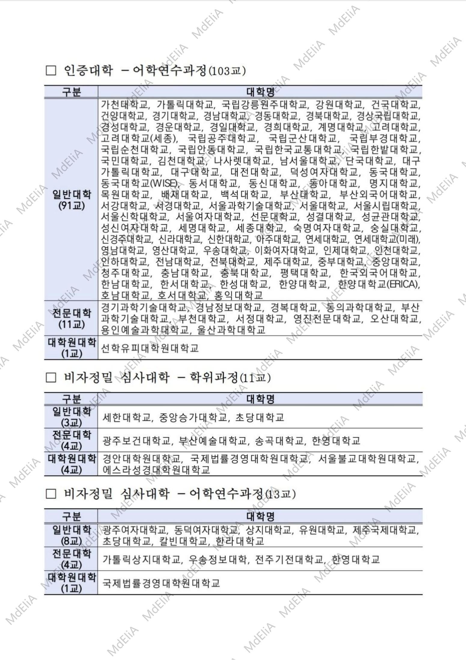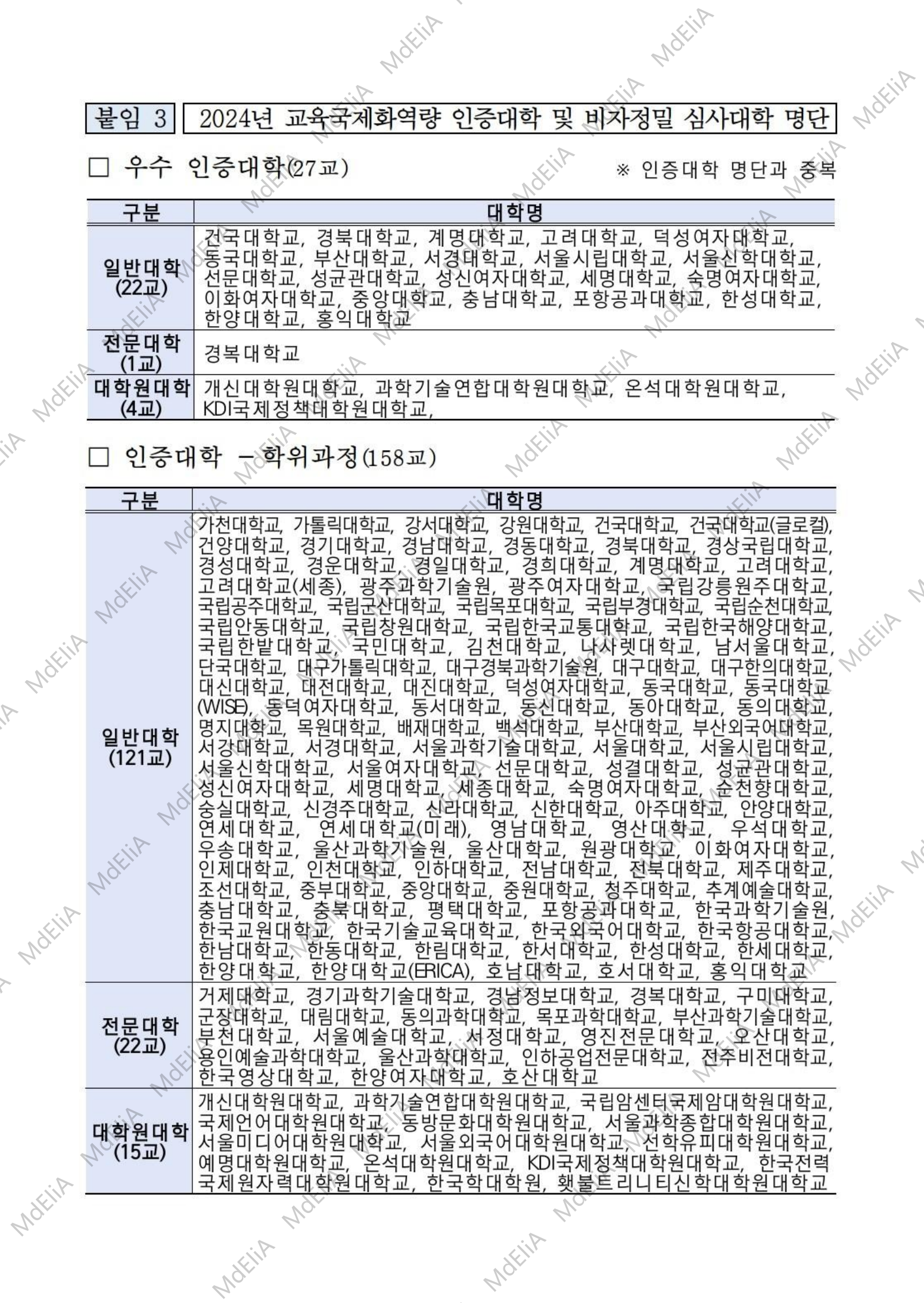 除了认证大学之外,韩国政府还对每所至少有1名外国学生在读的大学进行实况调查。如果未能通过某些标准,这些大学将被指定为签证审查强化大学。本次审查结果中,有24所大学被列入签证精密审查对象(学位课程11所,语言研修课程13所),并从2025年第二学期起限制发放签证一年。