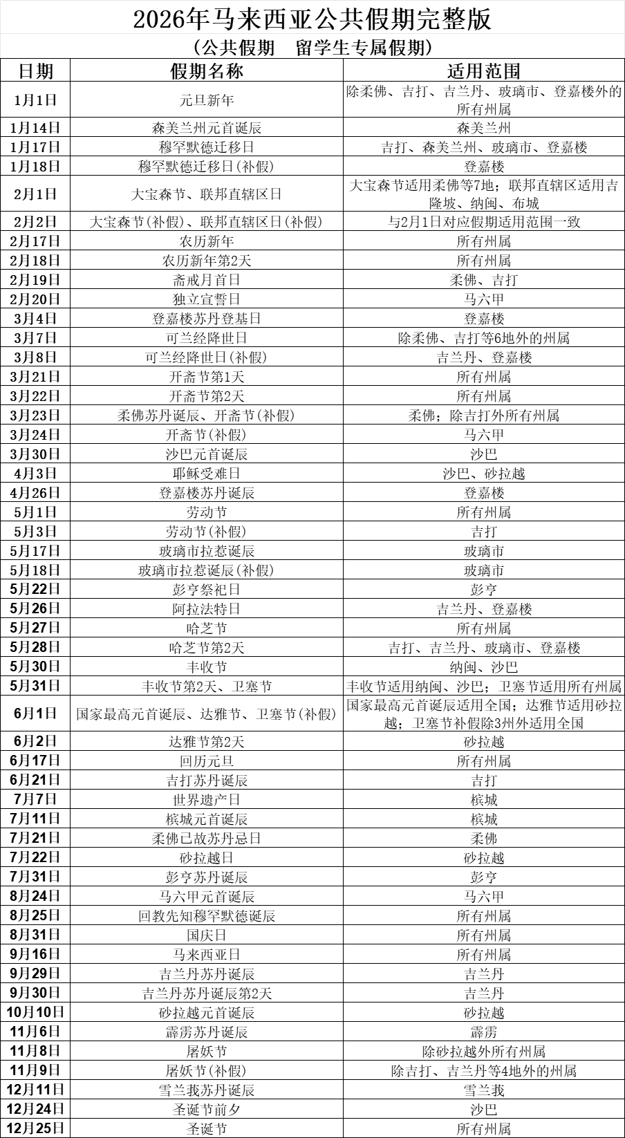 2026年马来西亚公共假期完整版